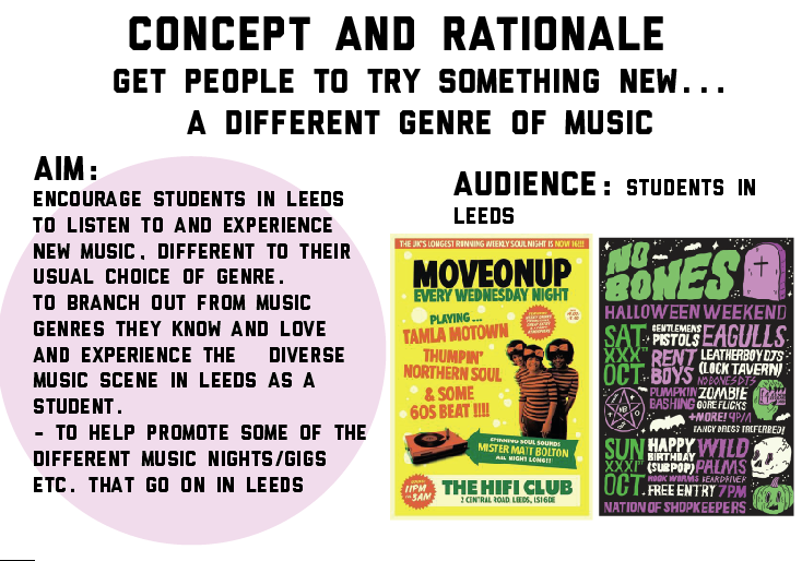 - to encourage people to branch out from music genres they know and love and experience the diverse music scene in Leeds as a student